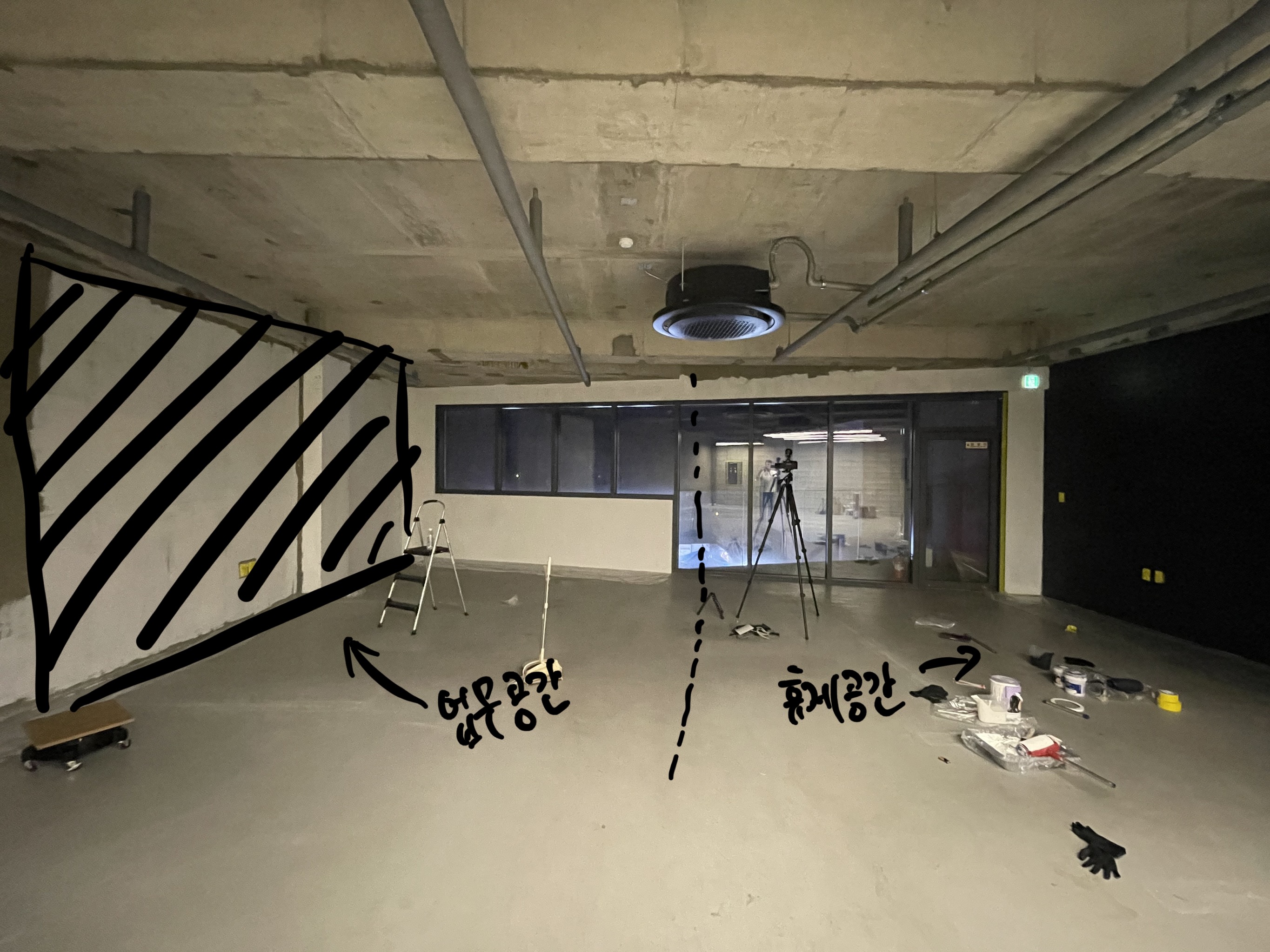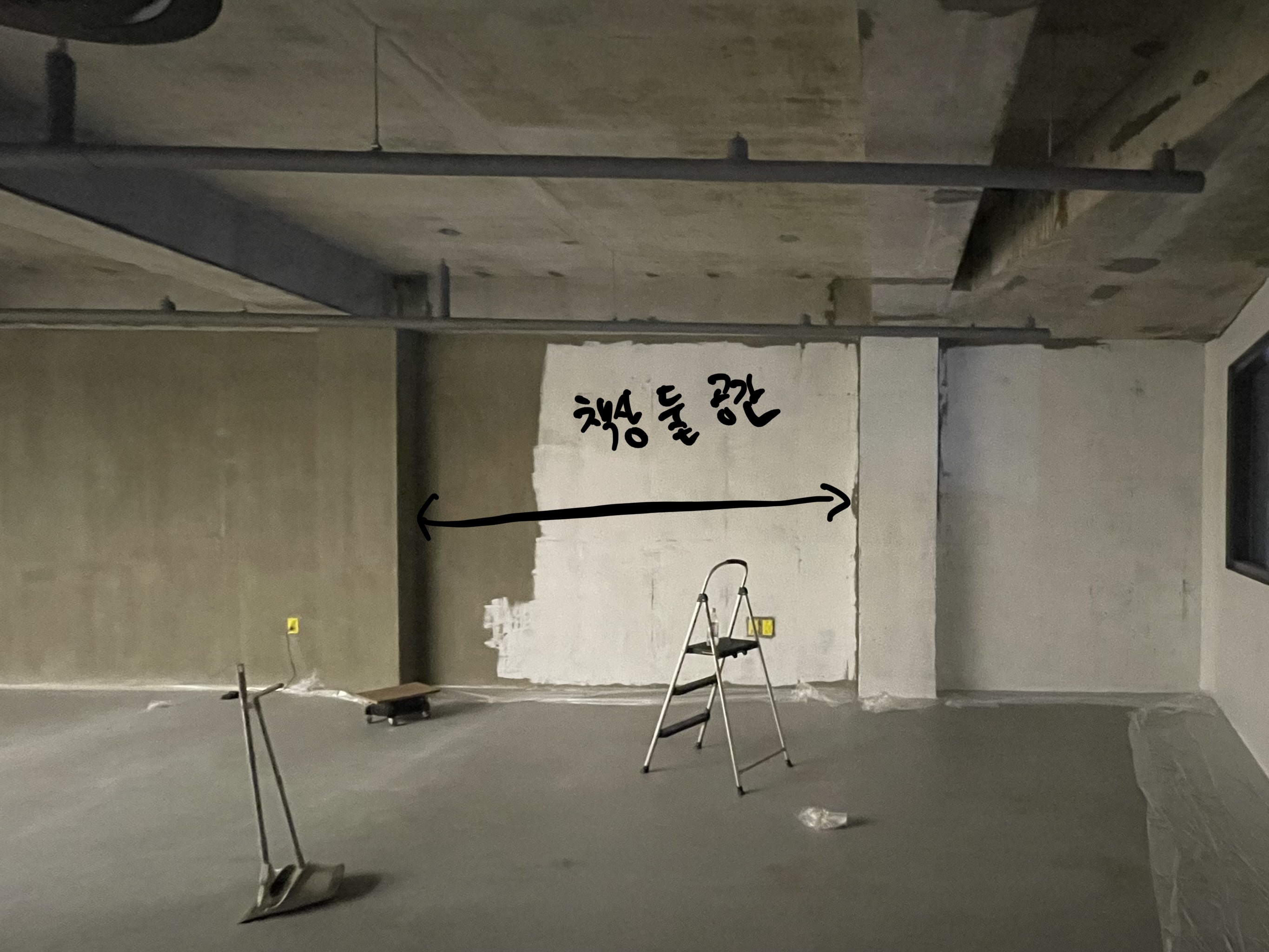왼쪽을 업무공간으로 만들 곳이다. 오른쪽 휴게공간은 빛 반사를 줄이고 편안한 느낌을 주기 위해서 벽을 검은색으로 칠했지만, 업무공간은 집중도를 높이기 위해서 흰색으로 벽을 칠했다. (다시 한번 말하지만 페인트 작업은 꼭 업체를 불러서 하길 바란다)