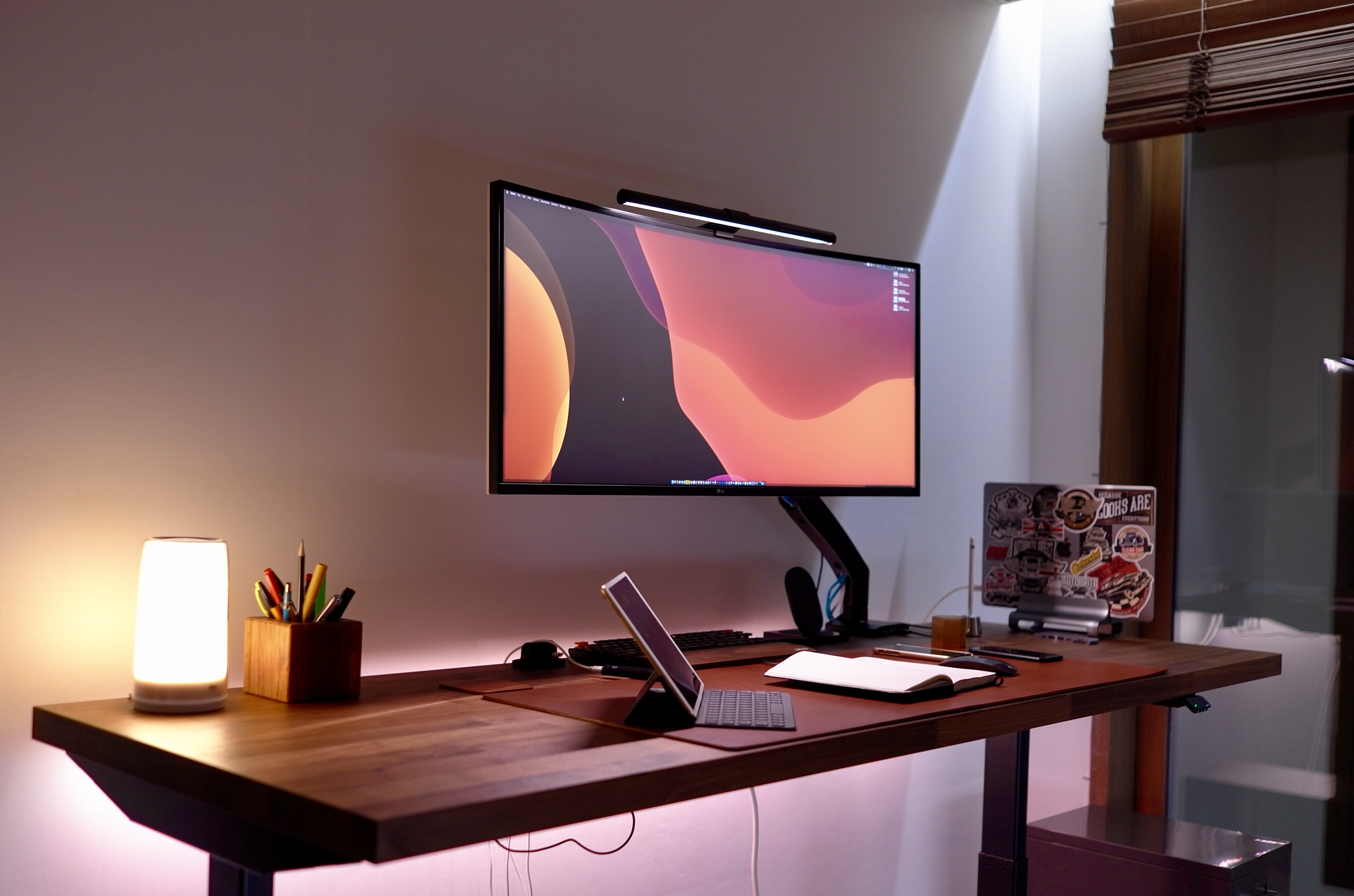 이렇게 2.4미터가 넘는 책상에서 업무를 시작하게 되었다. 1.84m 책상도 충분히 크다고 생각했는데, 마치 모니터 크기처럼 책상은 크면 클수록 좋다. 38인치 모니터를 올리고도 저렇게나 양옆으로 공간이 남는다. 작업할 수 있는 공간이 저렇게 여유가 있으면 정리도 잘되고 컴퓨터, 노트북, 아이패드를 책상에 펼쳐 놓고 사용할 수가 있다.