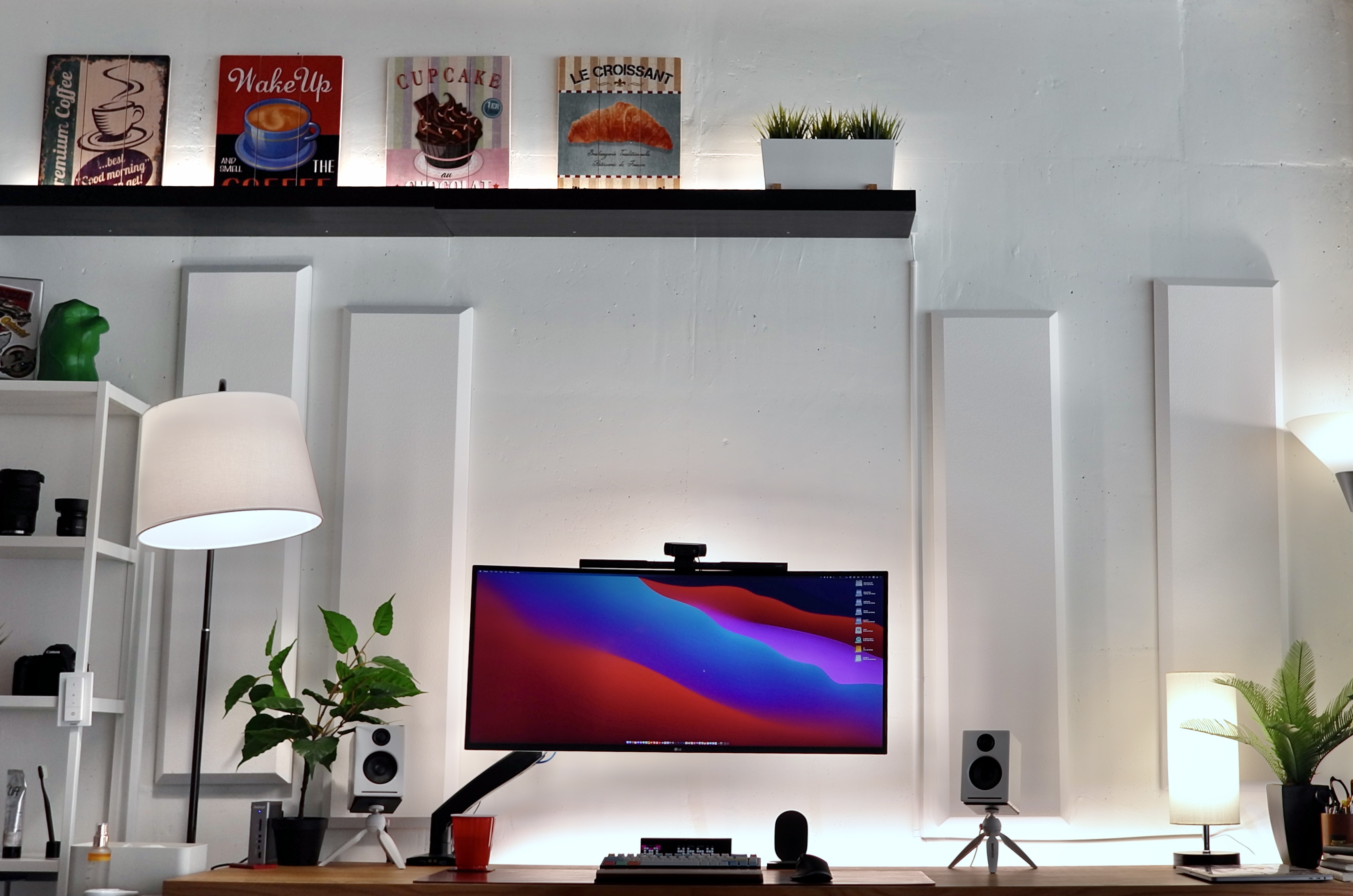 개인사무실 업무공간도 집 서재처럼 이케아 칼뷔 조리대 상판 + 에렉투스 모션 데스크 조합으로 책상을 조립했다. 그리고 책상 위쪽 공간을 채워줄 랙선반을 설치하고, 관상 및 소리 울림을 흡음해줄 나무 액자들을 구입해서 올려두었다.