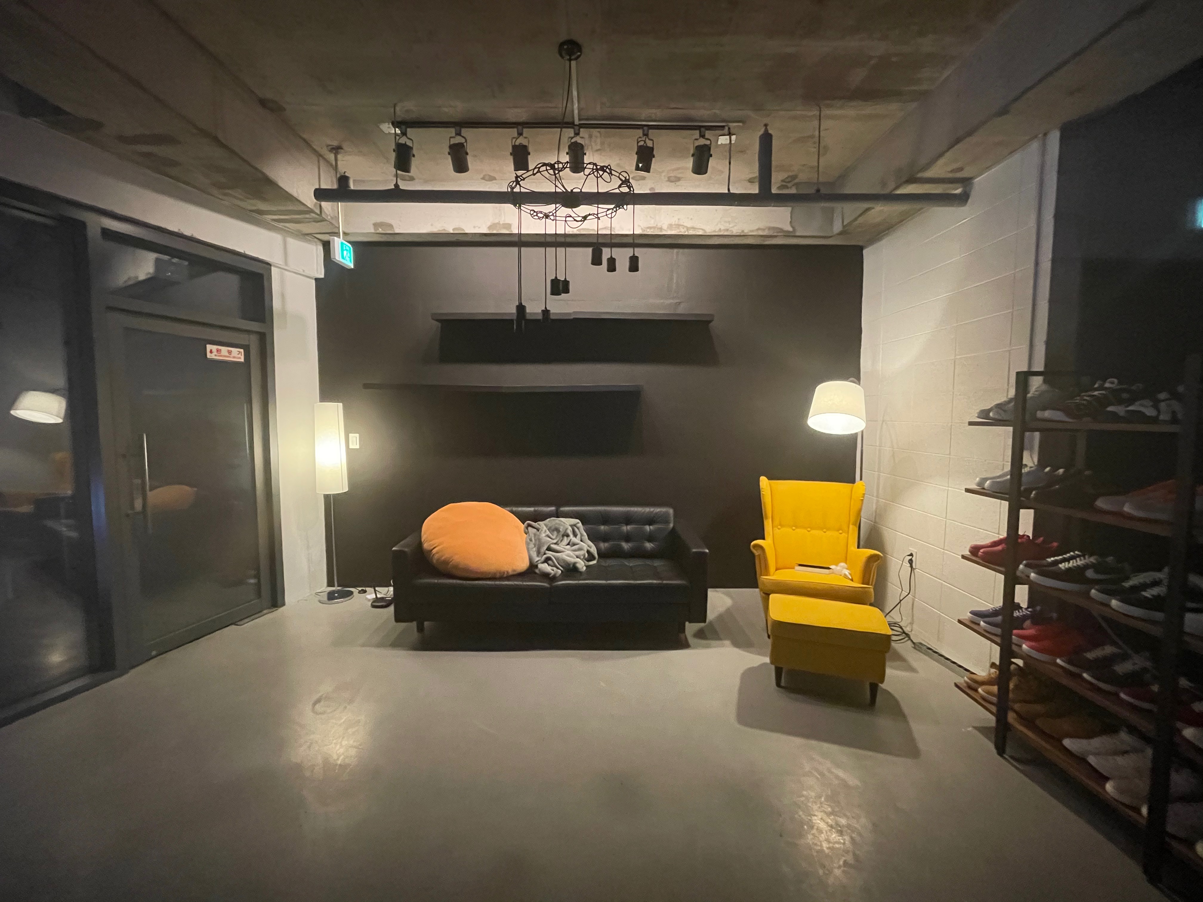 그리고 휴게공간에 레일조명, 펜던트 조명 그리고 랙 선반을 설치했다.