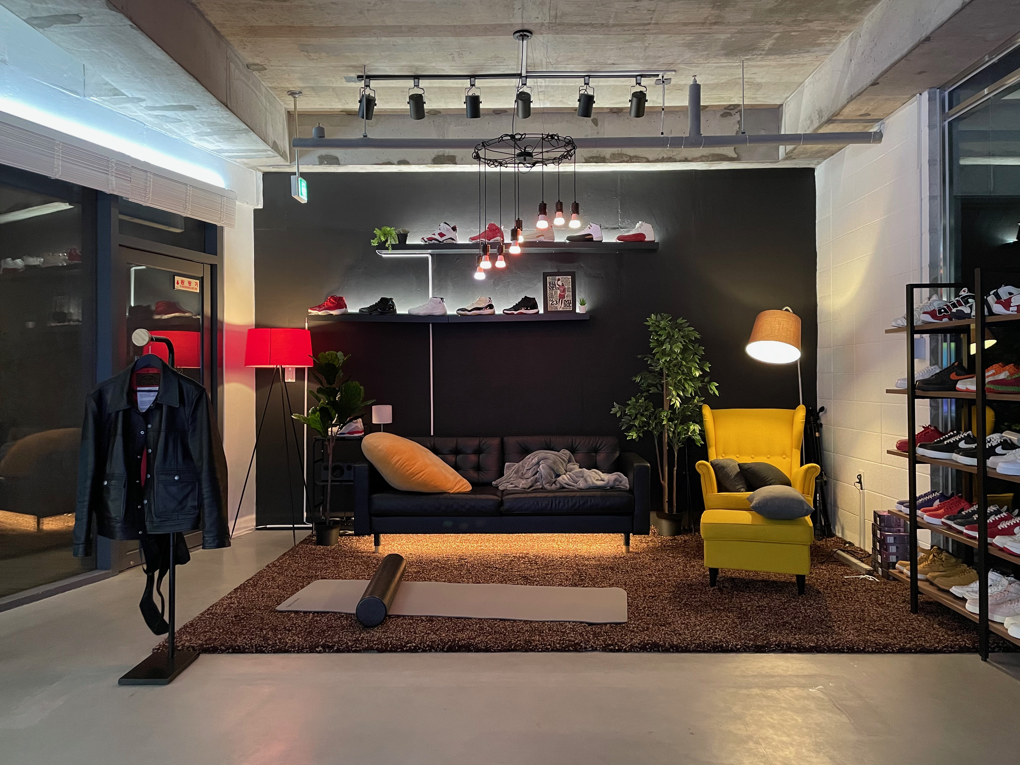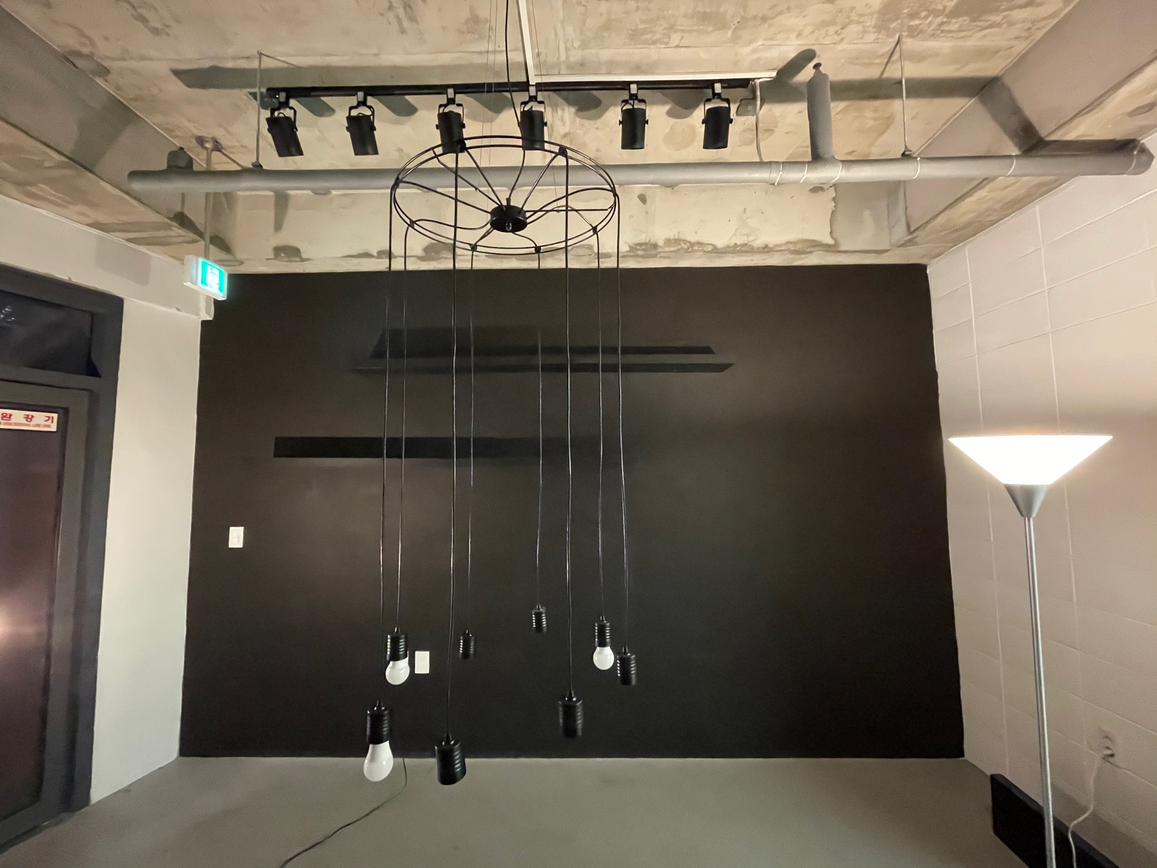 그리고 휴게공간에 레일조명, 펜던트 조명 그리고 랙 선반을 설치했다.