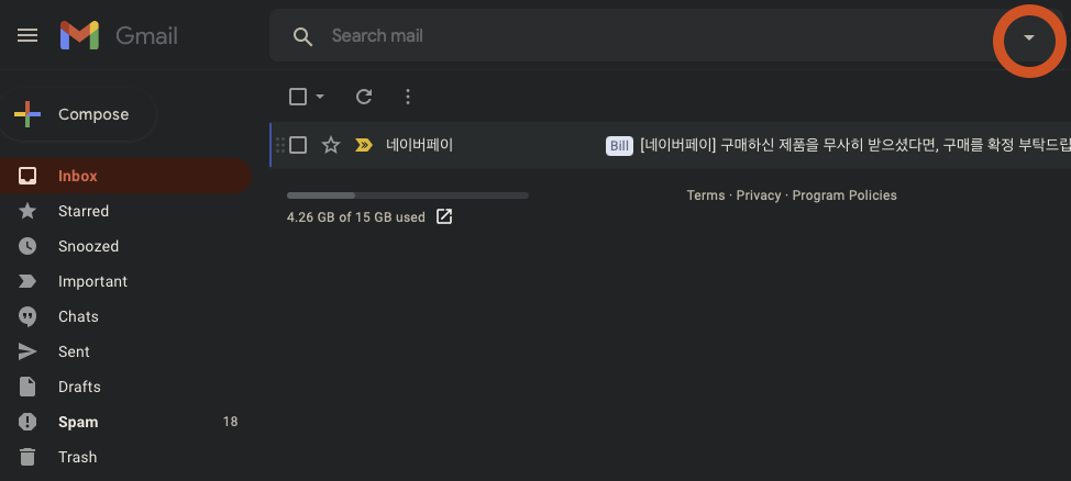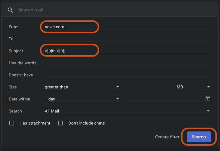 그럼 필터에서 보낸 사람 주소에 naver.com, 제목에 네이버페이를 넣고 검색을 하면 조건에 맞는 메일들이 검색된다. 검색된 메일이 네이버 페이 주문 관련 메일이면 필터 조건을 제대로 작성한 것이다.