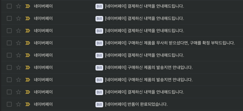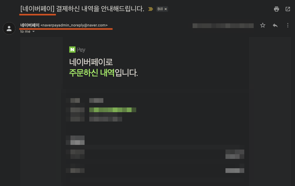 예를 들어, 물건을 구매하면 주문 확인 메일이 오는 것에 적용을 해보자. 네이버 페이에서 주문을 하면 오는 주문내역 메일을 보면, 보낸 사람 주소에 naver.com이 포함되어 있고 제목에는 네이버 페이가 포함되어 있다.