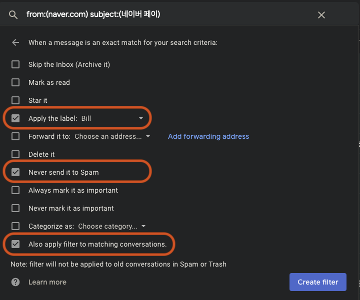 그런 다음 이전에 만들었던 라벨을 적용시키면 된다. 본인은 주문 관련된 메일이니 'Bill'이란 라벨을 적용했다. 그리고 필터 만들기를 클릭하면 라벨을 자동으로 적용하는 필터가 만들어졌다. 추가로 메일을 스팸함으로 넣고 싶지 않다면 스팸함으로 보내지 않기를 체크한다. 그리고 이전 메일들에 라벨을 모두 적용시키려면 마지막 조건에도 체크를 해주면 된다.
