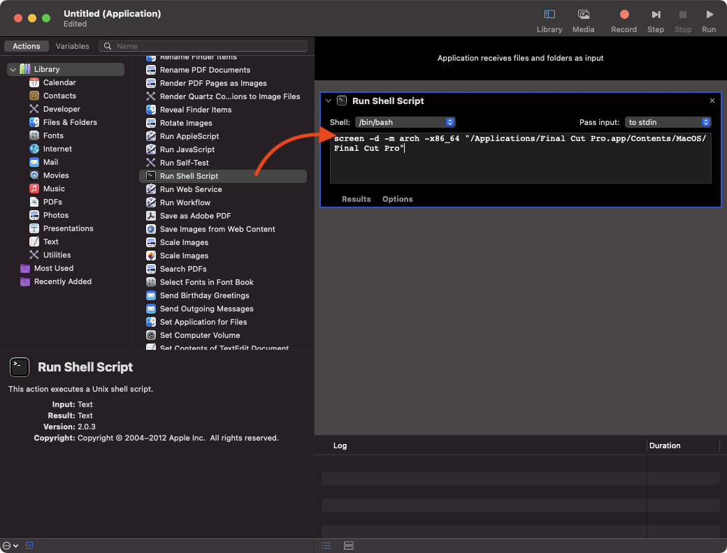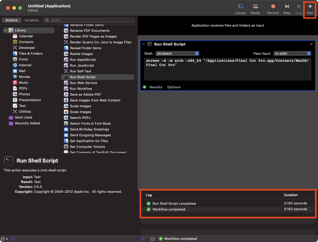 그리고 오른쪽 상단에 실행(Run)을 해서 파이널 컷 프로가 로제타 모드로 실행되는지 확인한다. 제대로 실행이 되면 아래쪽 Log에 실행이 되었다고 기록이 나온다.