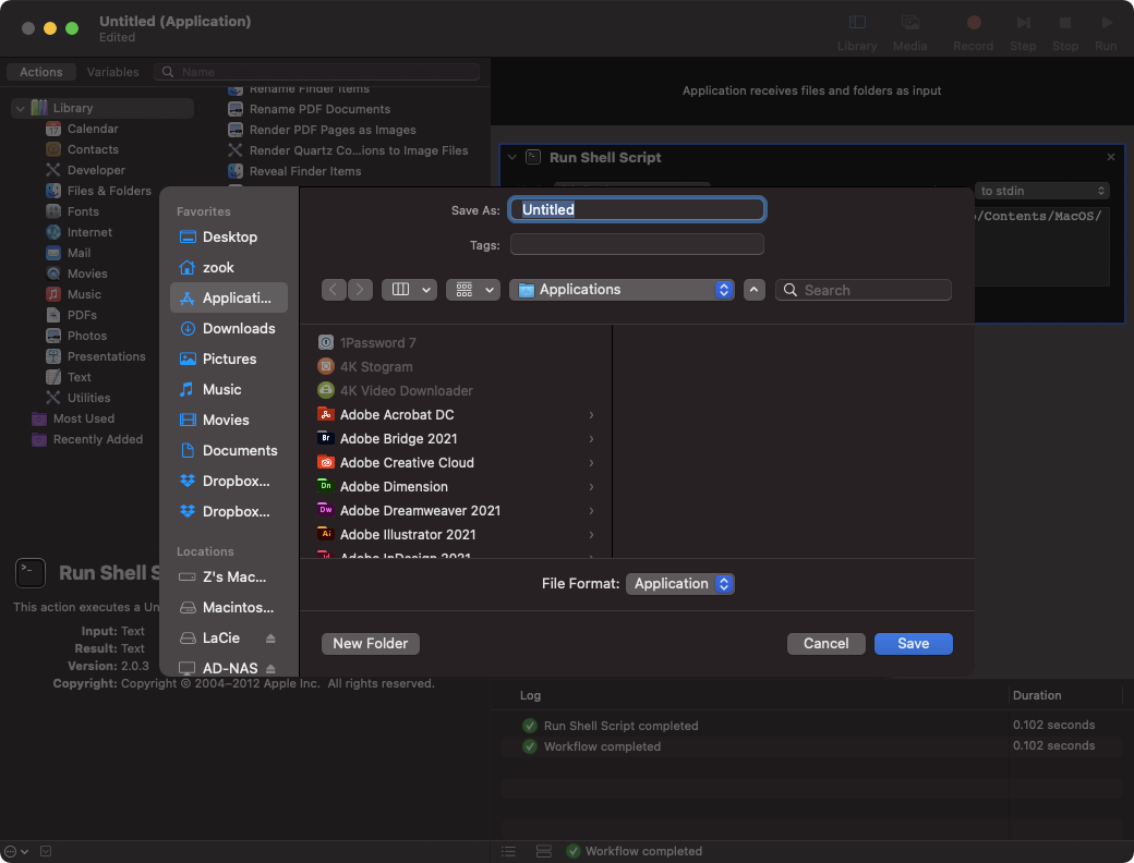 쉘 스트립트 실행 (Run Shell Script)를 선택해서 오른쪽 창으로 드래그한다. 그럼 터미널 명령어를 입력할 수 있는 워크플로우가 만들어진다. 여기에 아까 터미널 명령어를 적는다.