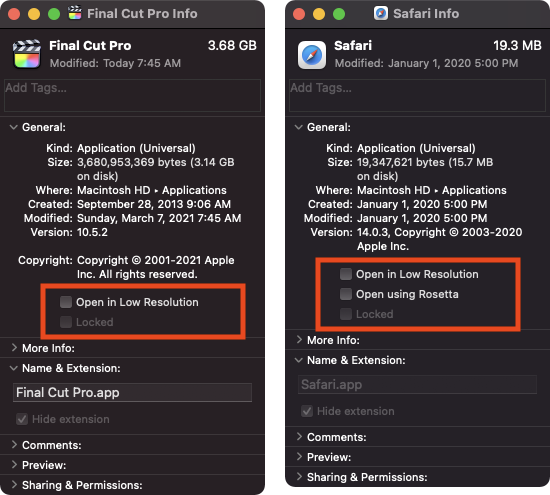 가장 간단한 해결방법은 파이널 컷 프로를 로제타로 실행하면 된다는 것이다. 로제타 모드로 앱을 실행하는 방법은 로제타로 실행을 원하는 앱을 선택하고 ⌘+i를 누르면 앱정보에서 로제타로 실행할 수 있는 옵션이 있다. 그런데 이번에 파이널 컷 프로가 10.5.2 버전으로 업데이트 되면서 이 부분이 사라졌다.